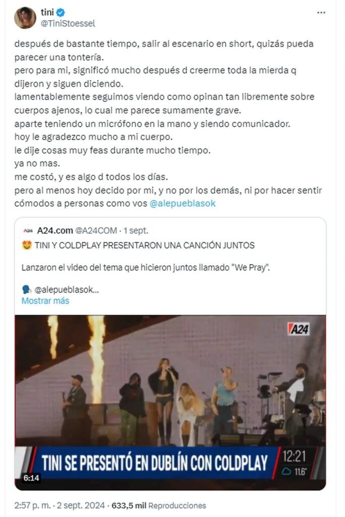 Ante estas declaraciones, y tras una ola de defensa de parte de sus fans, Tini utilizó su cuenta en X (ex Twitter) para expresar su descontento. “Después de bastante tiempo, salir al escenario en short, quizás pueda parecer una tontería; pero para mí, significó mucho después de creerme toda la mierda que dijeron y siguen diciendo. Lamentablemente, seguimos viendo cómo opinan tan libremente sobre cuerpos ajenos, lo cual me parece sumamente grave. Aparte teniendo un micrófono en la mano y siendo comunicador”, arrancó la joven.