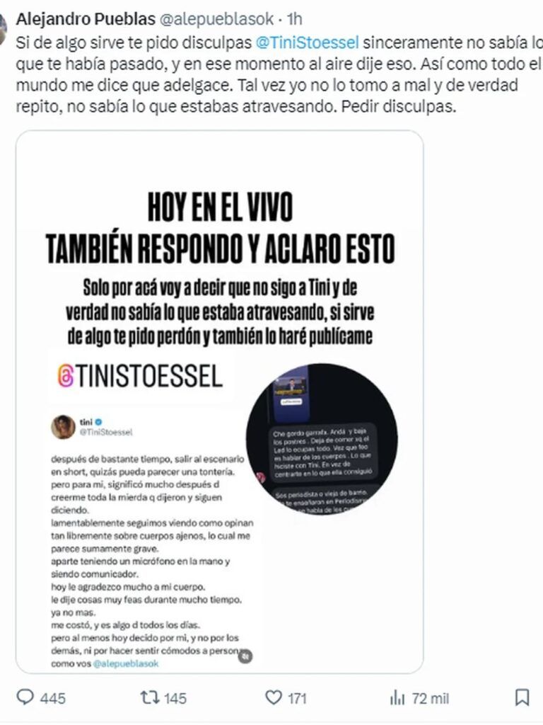 Poco después, Pueblas salió a disculparse y dejó en claro que desconocía que sus comentarios, que según él buscaron ser en tono humorístico, podrían afectar tanto a la intérprete. “Si de algo sirve te pido disculpas, Tini Stoessel”, arrancó el periodista. Y sumó: “Sinceramente, no sabía lo que te había pasado y, en ese momento, al aire dije eso. Así como todo el mundo me dice que adelgace. Tal vez yo no lo tomo a mal y de verdad repito, no sabía lo que estabas atravesando. Pedir disculpas”.