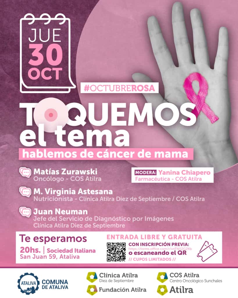 Este jueves 30 de octubre, a las 20 hs, en la Sociedad Italiana de Ataliva (San Juan 59), se compartirá la conferencia que cierra el ciclo organizado por Atilra, en el marco de las acciones de sensibilización y acompañamiento en este #OctubreRosa 2025, en esta ocasión organizada en conjunto con la Comuna de Ataliva.