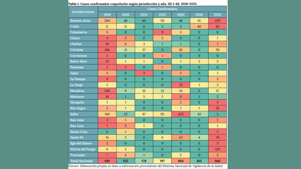 El aumento se da en un contexto nacional complejo. Entre las semanas epidemiológicas 1 y 49 se confirmaron 846 casos en el país, una cifra que supera a la de los últimos cuatro años, con 7 fallecimientos, todos en menores de 2 años.