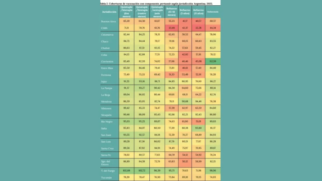 El análisis de las coberturas de vacunación con componente pertussis muestra que Santa Fe se encuentra entre las jurisdicciones con niveles intermedios a bajos, especialmente en los refuerzos de los 5 y 11 años.