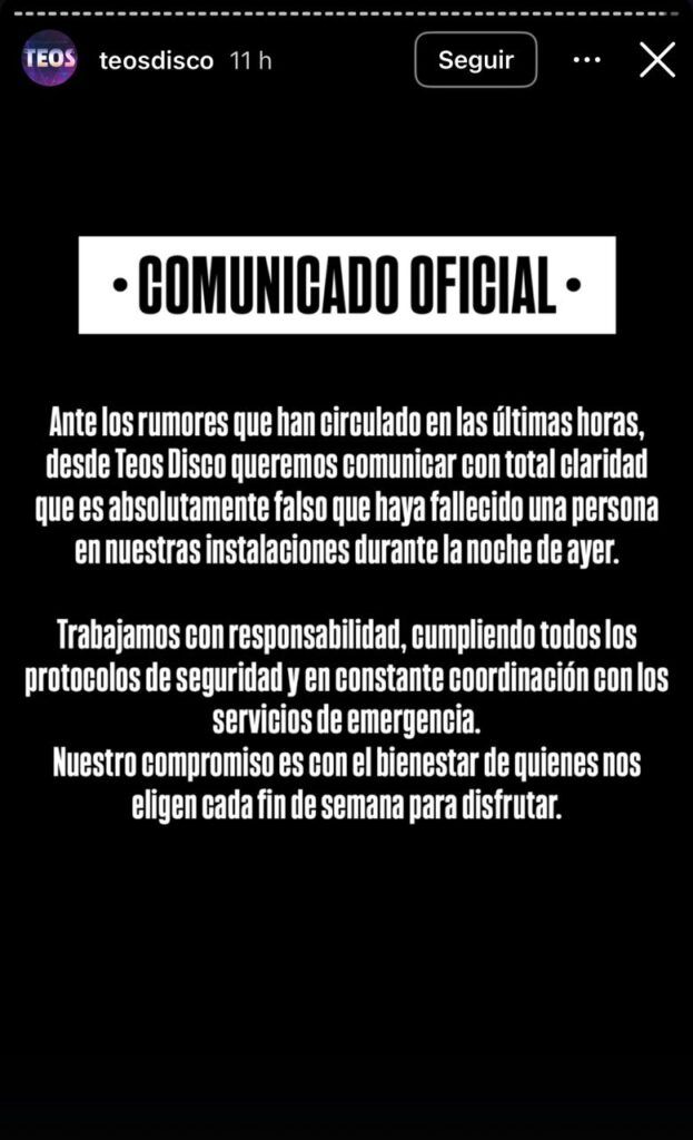 Ante los rumores que han circulado en las últimas horas, desde Teos Disco queremos comunicar con total claridad que es absolutamente falso que haya fallecido una persona en nuestras instalaciones durante la noche de ayer.
