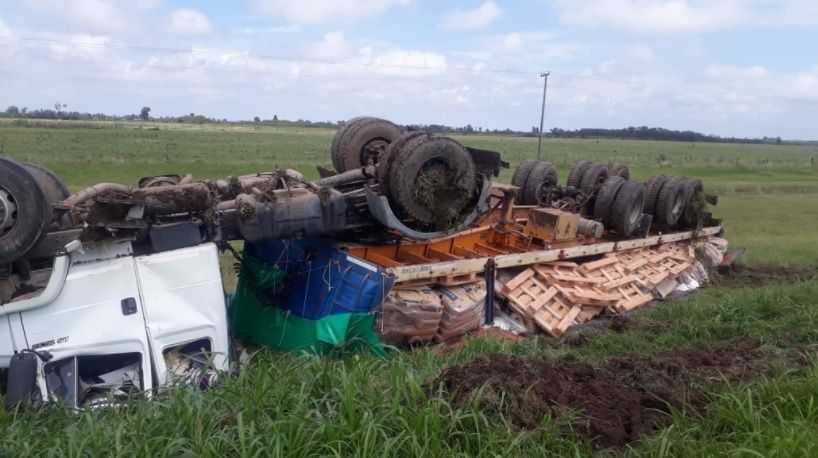 El camión Mercedes Benz color blanco, cargado por completo con bolsas de azúcar y palets, acabó volcando en la banquina por razones que se desconocen. La cabina se dañó por completo.