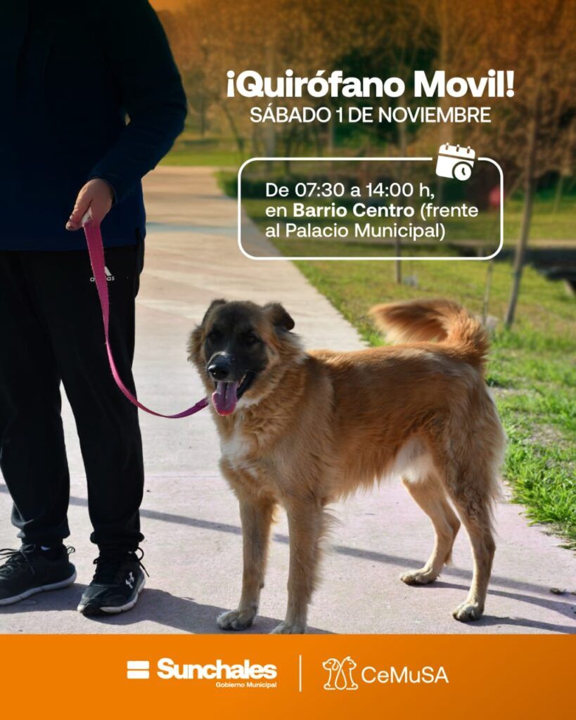 La Municipalidad de Sunchales informa que el sábado 1 de noviembre, de 7:30 a 14:00 hs⏰, estará disponible el Quirófano Móvil 🚐 en Barrio Centro, frente al Palacio Municipal 🏡 para realizar castraciones gratuitas de caninos hembras 💉🐕, con turno asignado.
