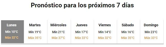 Locales Vuelven los días de calor en la ciudad ·14 febrero, 2022 ·Lisandro D'Angelis Reenviar Twittear Compartir Así lo informa el SMN a través de su web. La máxima de este lunes tocará los 32 grados y la jornada se presentará agradable, con sol pleno. Lo mismo sucederá el resto de la semana. ¿El registro más alto? El miércoles, con 37 grados centígrados. Noticias relacionadas Sunchales reconoce a cooperativas y mutuales escolares 6 octubre, 2025 Pablo Farías: “Desde Provincias Unidas queremos llevar al Congreso el estilo de gestión que tenemos en Santa Fe” 6 octubre, 2025 Corte de energía programado para este domingo 5 3 octubre, 2025 El intendente Pinotti mantuvo una reunión con el gobernador Pullaro 1 octubre, 2025 Pinotti presentó la revitalización del Predio Ferroviario que demandará una inversión de 820 millones de pesos 30 septiembre, 2025 Pinotti impulsa obras hídricas, pavimento y equipamiento municipal en su encuentro con el gobernador 30 septiembre, 2025 Navegación de entradas Siguiente noticiaAnterior noticia
